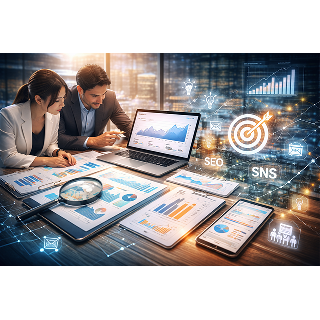 Webマーケティングの成果を最大化します。広告配信にとどまらず、SEO・SNS運用・コンテンツ制作までを含めたトータルな集客導線を構築。オンラインでの存在感を高め、ブランド価値と売上の成長を力強く支援します。